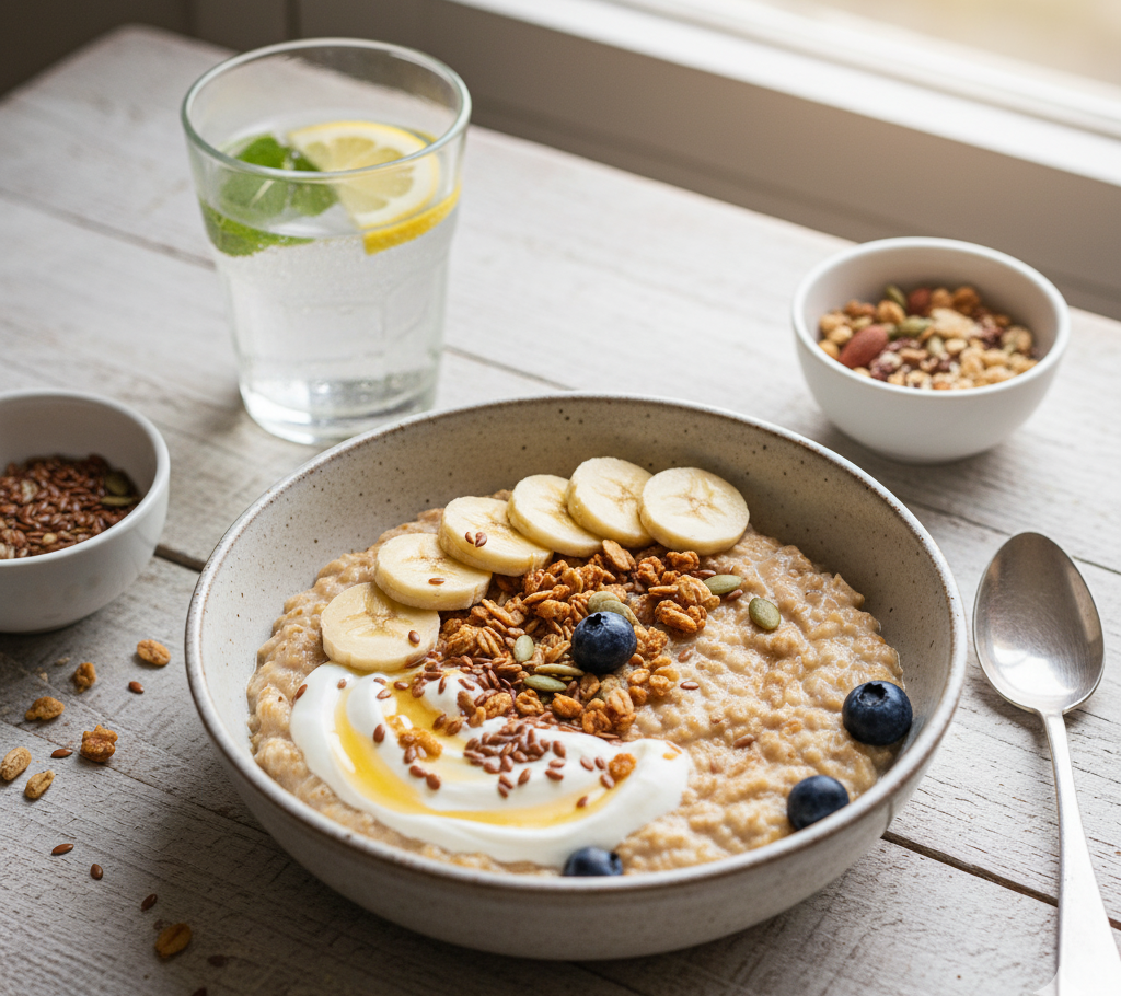 オートミールに含まれる水溶性食物繊維β-グルカンは、胃や腸を刺激せず便通を整える働きがあります。バナナのペクチンが腸内の善玉菌を増やし、低GI食品で血糖値も安定。朝食に最適で、腸活と胃腸ケアを両立できます。 - アレンジ例: