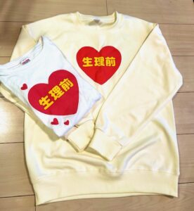 真っ白なTシャツとトレーナーを用意しました。デザインは主人が考えてプリントしてくれ、生理前になると私がそれを着るだけでOKです。これが意外と効果的で、自分も「今、生理前やな」と俯瞰できるようになりました。主人も子どももすぐに状況を理解できるので、お互いに必要以上にぶつかることが減りました。もちろん家の中限定です(笑)